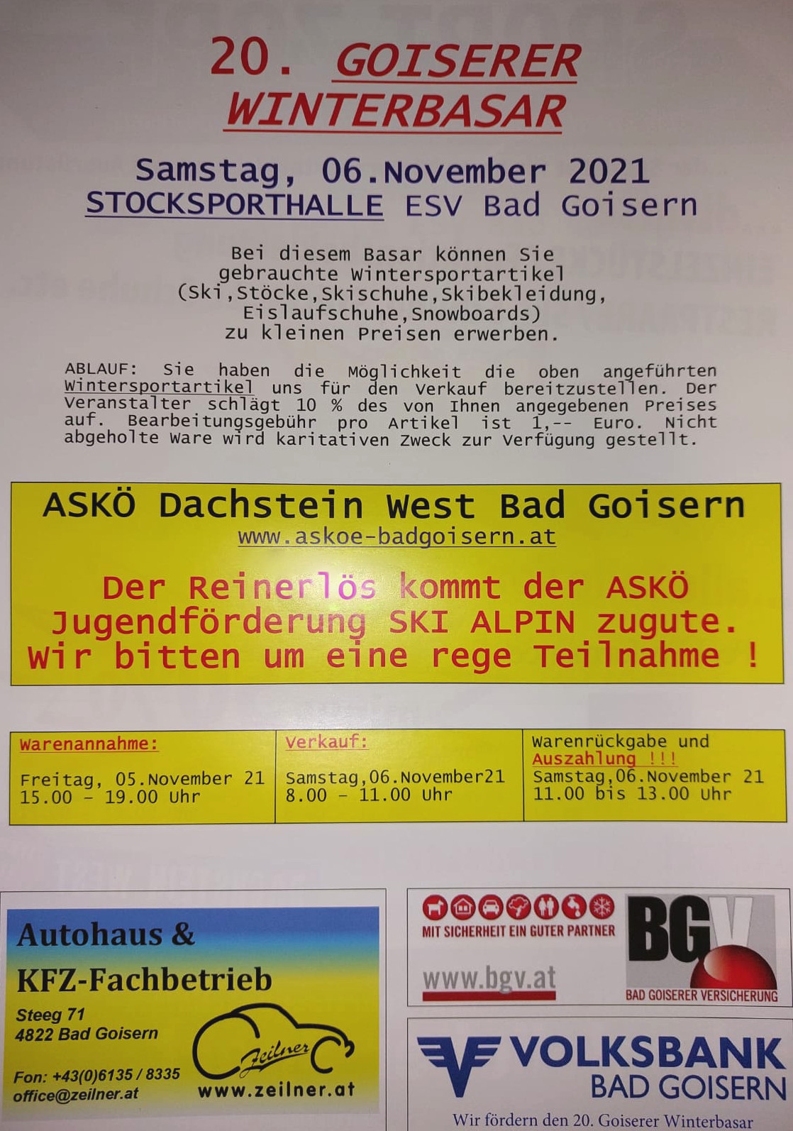 ABLAUF: Sie haben die Möglichkeit die oben angeführten Wintersportartikel uns für den Verkauf bereitzustellen. Der Veranstalter schlägt 10 % des von Ihnen angegebenen Preises auf. Bearbeitungsgebühr pro Artikel ist 1,-- Euro. Nicht abgeholte Ware wird karitativen Zweck zur Verfügung gestellt.